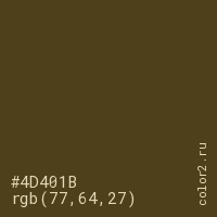 Цвет #4D401B в цветовой модели RGB обозначается тремя октетами (77, 64, 27) в десятичном формате и #4D401B в шестнадцатиричном (hex) формате, которые являются интенсивностью красного 77 (hex 4D), интенсивность зелёного 64 (hex 40) и интенсивность синего 27 (hex 1B).