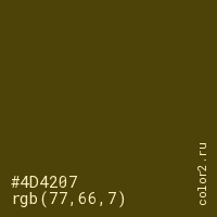 Цвет #4D4207 в цветовой модели RGB обозначается тремя октетами (77, 66, 7) в десятичном формате и #4D4207 в шестнадцатиричном (hex) формате, которые являются интенсивностью красного 77 (hex 4D), интенсивность зелёного 66 (hex 42) и интенсивность синего 7 (hex 07).