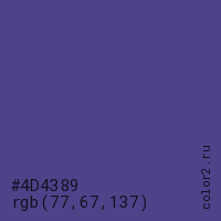 Цвет #4D4389 в цветовой модели RGB обозначается тремя октетами (77, 67, 137) в десятичном формате и #4D4389 в шестнадцатиричном (hex) формате, которые являются интенсивностью красного 77 (hex 4D), интенсивность зелёного 67 (hex 43) и интенсивность синего 137 (hex 89).
