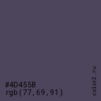 Цвет #4D455B в цветовой модели RGB обозначается тремя октетами (77, 69, 91) в десятичном формате и #4D455B в шестнадцатиричном (hex) формате, которые являются интенсивностью красного 77 (hex 4D), интенсивность зелёного 69 (hex 45) и интенсивность синего 91 (hex 5B).