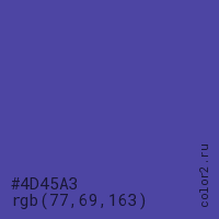 Цвет #4D45A3 в цветовой модели RGB обозначается тремя октетами (77, 69, 163) в десятичном формате и #4D45A3 в шестнадцатиричном (hex) формате, которые являются интенсивностью красного 77 (hex 4D), интенсивность зелёного 69 (hex 45) и интенсивность синего 163 (hex A3).