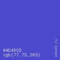 Цвет #4D49CD в цветовой модели RGB обозначается тремя октетами (77, 73, 205) в десятичном формате и #4D49CD в шестнадцатиричном (hex) формате, которые являются интенсивностью красного 77 (hex 4D), интенсивность зелёного 73 (hex 49) и интенсивность синего 205 (hex CD).