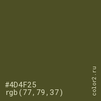 Цвет #4D4F25 в цветовой модели RGB обозначается тремя октетами (77, 79, 37) в десятичном формате и #4D4F25 в шестнадцатиричном (hex) формате, которые являются интенсивностью красного 77 (hex 4D), интенсивность зелёного 79 (hex 4F) и интенсивность синего 37 (hex 25).