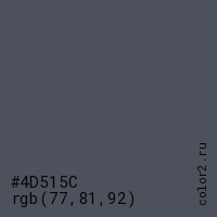 Цвет #4D515C в цветовой модели RGB обозначается тремя октетами (77, 81, 92) в десятичном формате и #4D515C в шестнадцатиричном (hex) формате, которые являются интенсивностью красного 77 (hex 4D), интенсивность зелёного 81 (hex 51) и интенсивность синего 92 (hex 5C).