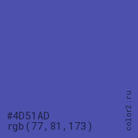 Цвет #4D51AD в цветовой модели RGB обозначается тремя октетами (77, 81, 173) в десятичном формате и #4D51AD в шестнадцатиричном (hex) формате, которые являются интенсивностью красного 77 (hex 4D), интенсивность зелёного 81 (hex 51) и интенсивность синего 173 (hex AD).