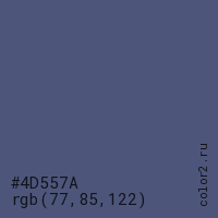 Цвет #4D557A в цветовой модели RGB обозначается тремя октетами (77, 85, 122) в десятичном формате и #4D557A в шестнадцатиричном (hex) формате, которые являются интенсивностью красного 77 (hex 4D), интенсивность зелёного 85 (hex 55) и интенсивность синего 122 (hex 7A).