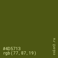 Цвет #4D5713 в цветовой модели RGB обозначается тремя октетами (77, 87, 19) в десятичном формате и #4D5713 в шестнадцатиричном (hex) формате, которые являются интенсивностью красного 77 (hex 4D), интенсивность зелёного 87 (hex 57) и интенсивность синего 19 (hex 13).
