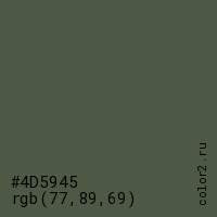 Цвет #4D5945 в цветовой модели RGB обозначается тремя октетами (77, 89, 69) в десятичном формате и #4D5945 в шестнадцатиричном (hex) формате, которые являются интенсивностью красного 77 (hex 4D), интенсивность зелёного 89 (hex 59) и интенсивность синего 69 (hex 45).