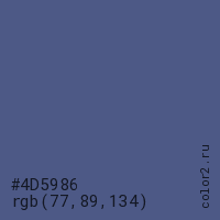 Цвет #4D5986 в цветовой модели RGB обозначается тремя октетами (77, 89, 134) в десятичном формате и #4D5986 в шестнадцатиричном (hex) формате, которые являются интенсивностью красного 77 (hex 4D), интенсивность зелёного 89 (hex 59) и интенсивность синего 134 (hex 86).
