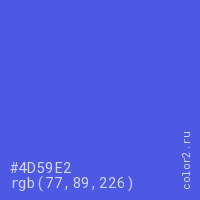 Цвет #4D59E2 в цветовой модели RGB обозначается тремя октетами (77, 89, 226) в десятичном формате и #4D59E2 в шестнадцатиричном (hex) формате, которые являются интенсивностью красного 77 (hex 4D), интенсивность зелёного 89 (hex 59) и интенсивность синего 226 (hex E2).