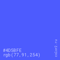Цвет #4D5BFE в цветовой модели RGB обозначается тремя октетами (77, 91, 254) в десятичном формате и #4D5BFE в шестнадцатиричном (hex) формате, которые являются интенсивностью красного 77 (hex 4D), интенсивность зелёного 91 (hex 5B) и интенсивность синего 254 (hex FE).
