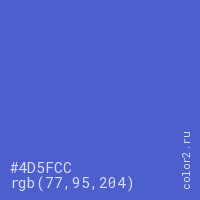 Цвет #4D5FCC в цветовой модели RGB обозначается тремя октетами (77, 95, 204) в десятичном формате и #4D5FCC в шестнадцатиричном (hex) формате, которые являются интенсивностью красного 77 (hex 4D), интенсивность зелёного 95 (hex 5F) и интенсивность синего 204 (hex CC).