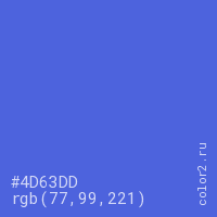 Цвет #4D63DD в цветовой модели RGB обозначается тремя октетами (77, 99, 221) в десятичном формате и #4D63DD в шестнадцатиричном (hex) формате, которые являются интенсивностью красного 77 (hex 4D), интенсивность зелёного 99 (hex 63) и интенсивность синего 221 (hex DD).