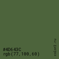 Цвет #4D643C в цветовой модели RGB обозначается тремя октетами (77, 100, 60) в десятичном формате и #4D643C в шестнадцатиричном (hex) формате, которые являются интенсивностью красного 77 (hex 4D), интенсивность зелёного 100 (hex 64) и интенсивность синего 60 (hex 3C).