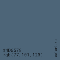 Цвет #4D6578 в цветовой модели RGB обозначается тремя октетами (77, 101, 120) в десятичном формате и #4D6578 в шестнадцатиричном (hex) формате, которые являются интенсивностью красного 77 (hex 4D), интенсивность зелёного 101 (hex 65) и интенсивность синего 120 (hex 78).