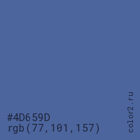Цвет #4D659D в цветовой модели RGB обозначается тремя октетами (77, 101, 157) в десятичном формате и #4D659D в шестнадцатиричном (hex) формате, которые являются интенсивностью красного 77 (hex 4D), интенсивность зелёного 101 (hex 65) и интенсивность синего 157 (hex 9D).