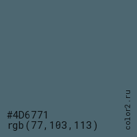 Цвет #4D6771 в цветовой модели RGB обозначается тремя октетами (77, 103, 113) в десятичном формате и #4D6771 в шестнадцатиричном (hex) формате, которые являются интенсивностью красного 77 (hex 4D), интенсивность зелёного 103 (hex 67) и интенсивность синего 113 (hex 71).