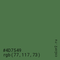 Цвет #4D7549 в цветовой модели RGB обозначается тремя октетами (77, 117, 73) в десятичном формате и #4D7549 в шестнадцатиричном (hex) формате, которые являются интенсивностью красного 77 (hex 4D), интенсивность зелёного 117 (hex 75) и интенсивность синего 73 (hex 49).