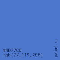 Цвет #4D77CD в цветовой модели RGB обозначается тремя октетами (77, 119, 205) в десятичном формате и #4D77CD в шестнадцатиричном (hex) формате, которые являются интенсивностью красного 77 (hex 4D), интенсивность зелёного 119 (hex 77) и интенсивность синего 205 (hex CD).