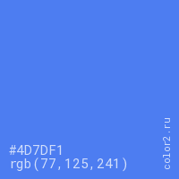 Цвет #4D7DF1 в цветовой модели RGB обозначается тремя октетами (77, 125, 241) в десятичном формате и #4D7DF1 в шестнадцатиричном (hex) формате, которые являются интенсивностью красного 77 (hex 4D), интенсивность зелёного 125 (hex 7D) и интенсивность синего 241 (hex F1).