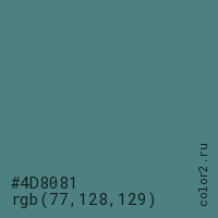 Цвет #4D8081 в цветовой модели RGB обозначается тремя октетами (77, 128, 129) в десятичном формате и #4D8081 в шестнадцатиричном (hex) формате, которые являются интенсивностью красного 77 (hex 4D), интенсивность зелёного 128 (hex 80) и интенсивность синего 129 (hex 81).