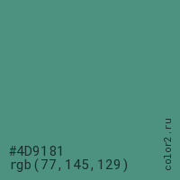 Цвет #4D9181 в цветовой модели RGB обозначается тремя октетами (77, 145, 129) в десятичном формате и #4D9181 в шестнадцатиричном (hex) формате, которые являются интенсивностью красного 77 (hex 4D), интенсивность зелёного 145 (hex 91) и интенсивность синего 129 (hex 81).