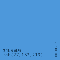 Цвет #4D98DB в цветовой модели RGB обозначается тремя октетами (77, 152, 219) в десятичном формате и #4D98DB в шестнадцатиричном (hex) формате, которые являются интенсивностью красного 77 (hex 4D), интенсивность зелёного 152 (hex 98) и интенсивность синего 219 (hex DB).