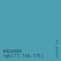 Цвет #4DA0B0 в цветовой модели RGB обозначается тремя октетами (77, 160, 176) в десятичном формате и #4DA0B0 в шестнадцатиричном (hex) формате, которые являются интенсивностью красного 77 (hex 4D), интенсивность зелёного 160 (hex A0) и интенсивность синего 176 (hex B0).