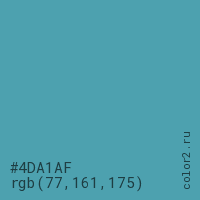 Цвет #4DA1AF в цветовой модели RGB обозначается тремя октетами (77, 161, 175) в десятичном формате и #4DA1AF в шестнадцатиричном (hex) формате, которые являются интенсивностью красного 77 (hex 4D), интенсивность зелёного 161 (hex A1) и интенсивность синего 175 (hex AF).
