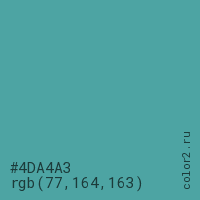 Цвет #4DA4A3 в цветовой модели RGB обозначается тремя октетами (77, 164, 163) в десятичном формате и #4DA4A3 в шестнадцатиричном (hex) формате, которые являются интенсивностью красного 77 (hex 4D), интенсивность зелёного 164 (hex A4) и интенсивность синего 163 (hex A3).