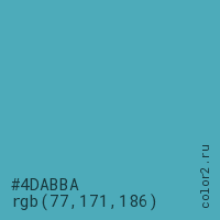 Цвет #4DABBA в цветовой модели RGB обозначается тремя октетами (77, 171, 186) в десятичном формате и #4DABBA в шестнадцатиричном (hex) формате, которые являются интенсивностью красного 77 (hex 4D), интенсивность зелёного 171 (hex AB) и интенсивность синего 186 (hex BA).