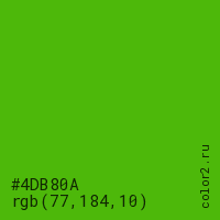 Цвет #4DB80A в цветовой модели RGB обозначается тремя октетами (77, 184, 10) в десятичном формате и #4DB80A в шестнадцатиричном (hex) формате, которые являются интенсивностью красного 77 (hex 4D), интенсивность зелёного 184 (hex B8) и интенсивность синего 10 (hex 0A).