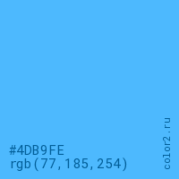 Цвет #4DB9FE в цветовой модели RGB обозначается тремя октетами (77, 185, 254) в десятичном формате и #4DB9FE в шестнадцатиричном (hex) формате, которые являются интенсивностью красного 77 (hex 4D), интенсивность зелёного 185 (hex B9) и интенсивность синего 254 (hex FE).