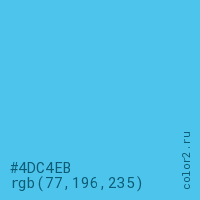 Цвет #4DC4EB в цветовой модели RGB обозначается тремя октетами (77, 196, 235) в десятичном формате и #4DC4EB в шестнадцатиричном (hex) формате, которые являются интенсивностью красного 77 (hex 4D), интенсивность зелёного 196 (hex C4) и интенсивность синего 235 (hex EB).