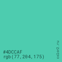 Цвет #4DCCAF в цветовой модели RGB обозначается тремя октетами (77, 204, 175) в десятичном формате и #4DCCAF в шестнадцатиричном (hex) формате, которые являются интенсивностью красного 77 (hex 4D), интенсивность зелёного 204 (hex CC) и интенсивность синего 175 (hex AF).