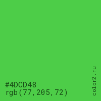 Цвет #4DCD48 в цветовой модели RGB обозначается тремя октетами (77, 205, 72) в десятичном формате и #4DCD48 в шестнадцатиричном (hex) формате, которые являются интенсивностью красного 77 (hex 4D), интенсивность зелёного 205 (hex CD) и интенсивность синего 72 (hex 48).