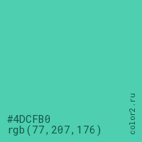Цвет #4DCFB0 в цветовой модели RGB обозначается тремя октетами (77, 207, 176) в десятичном формате и #4DCFB0 в шестнадцатиричном (hex) формате, которые являются интенсивностью красного 77 (hex 4D), интенсивность зелёного 207 (hex CF) и интенсивность синего 176 (hex B0).