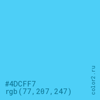 Цвет #4DCFF7 в цветовой модели RGB обозначается тремя октетами (77, 207, 247) в десятичном формате и #4DCFF7 в шестнадцатиричном (hex) формате, которые являются интенсивностью красного 77 (hex 4D), интенсивность зелёного 207 (hex CF) и интенсивность синего 247 (hex F7).