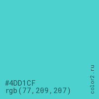 Цвет #4DD1CF в цветовой модели RGB обозначается тремя октетами (77, 209, 207) в десятичном формате и #4DD1CF в шестнадцатиричном (hex) формате, которые являются интенсивностью красного 77 (hex 4D), интенсивность зелёного 209 (hex D1) и интенсивность синего 207 (hex CF).