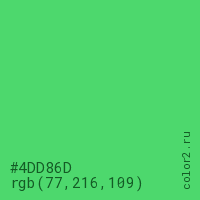 Цвет #4DD86D в цветовой модели RGB обозначается тремя октетами (77, 216, 109) в десятичном формате и #4DD86D в шестнадцатиричном (hex) формате, которые являются интенсивностью красного 77 (hex 4D), интенсивность зелёного 216 (hex D8) и интенсивность синего 109 (hex 6D).