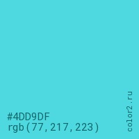 Цвет #4DD9DF в цветовой модели RGB обозначается тремя октетами (77, 217, 223) в десятичном формате и #4DD9DF в шестнадцатиричном (hex) формате, которые являются интенсивностью красного 77 (hex 4D), интенсивность зелёного 217 (hex D9) и интенсивность синего 223 (hex DF).