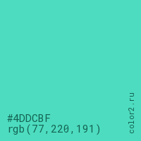Цвет #4DDCBF в цветовой модели RGB обозначается тремя октетами (77, 220, 191) в десятичном формате и #4DDCBF в шестнадцатиричном (hex) формате, которые являются интенсивностью красного 77 (hex 4D), интенсивность зелёного 220 (hex DC) и интенсивность синего 191 (hex BF).