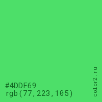 Цвет #4DDF69 в цветовой модели RGB обозначается тремя октетами (77, 223, 105) в десятичном формате и #4DDF69 в шестнадцатиричном (hex) формате, которые являются интенсивностью красного 77 (hex 4D), интенсивность зелёного 223 (hex DF) и интенсивность синего 105 (hex 69).
