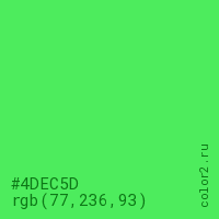 Цвет #4DEC5D в цветовой модели RGB обозначается тремя октетами (77, 236, 93) в десятичном формате и #4DEC5D в шестнадцатиричном (hex) формате, которые являются интенсивностью красного 77 (hex 4D), интенсивность зелёного 236 (hex EC) и интенсивность синего 93 (hex 5D).