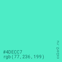 Цвет #4DECC7 в цветовой модели RGB обозначается тремя октетами (77, 236, 199) в десятичном формате и #4DECC7 в шестнадцатиричном (hex) формате, которые являются интенсивностью красного 77 (hex 4D), интенсивность зелёного 236 (hex EC) и интенсивность синего 199 (hex C7).