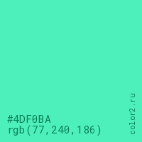 Цвет #4DF0BA в цветовой модели RGB обозначается тремя октетами (77, 240, 186) в десятичном формате и #4DF0BA в шестнадцатиричном (hex) формате, которые являются интенсивностью красного 77 (hex 4D), интенсивность зелёного 240 (hex F0) и интенсивность синего 186 (hex BA).