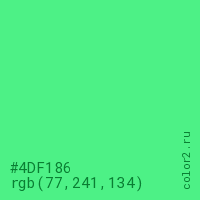 Цвет #4DF186 в цветовой модели RGB обозначается тремя октетами (77, 241, 134) в десятичном формате и #4DF186 в шестнадцатиричном (hex) формате, которые являются интенсивностью красного 77 (hex 4D), интенсивность зелёного 241 (hex F1) и интенсивность синего 134 (hex 86).