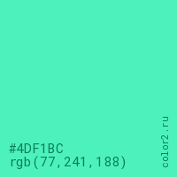 Цвет #4DF1BC в цветовой модели RGB обозначается тремя октетами (77, 241, 188) в десятичном формате и #4DF1BC в шестнадцатиричном (hex) формате, которые являются интенсивностью красного 77 (hex 4D), интенсивность зелёного 241 (hex F1) и интенсивность синего 188 (hex BC).