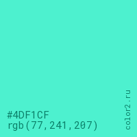 Цвет #4DF1CF в цветовой модели RGB обозначается тремя октетами (77, 241, 207) в десятичном формате и #4DF1CF в шестнадцатиричном (hex) формате, которые являются интенсивностью красного 77 (hex 4D), интенсивность зелёного 241 (hex F1) и интенсивность синего 207 (hex CF).