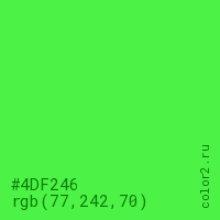 Цвет #4DF246 в цветовой модели RGB обозначается тремя октетами (77, 242, 70) в десятичном формате и #4DF246 в шестнадцатиричном (hex) формате, которые являются интенсивностью красного 77 (hex 4D), интенсивность зелёного 242 (hex F2) и интенсивность синего 70 (hex 46).